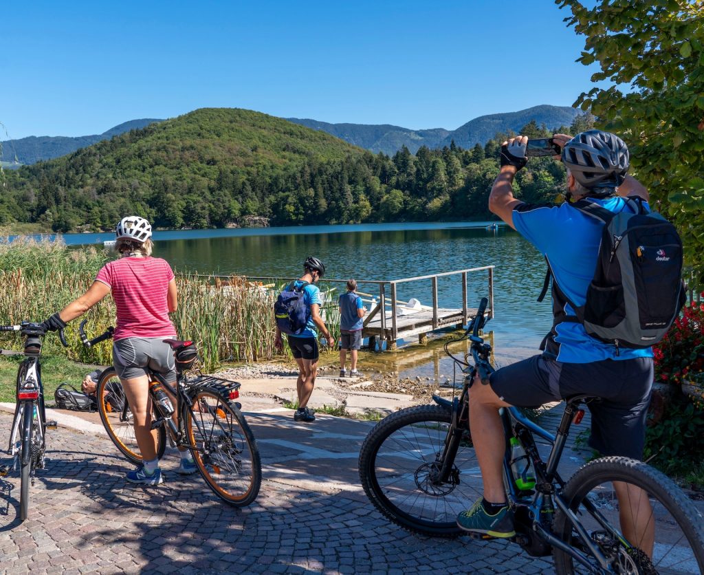 Der Große Montiggler See in der Nähe von Bozen in Südtirol glänzt mit hoher Wasserqualität und lieblicher Umgebung. Ein Spaziergang entlang des Ufers. (Foto: Alamy)