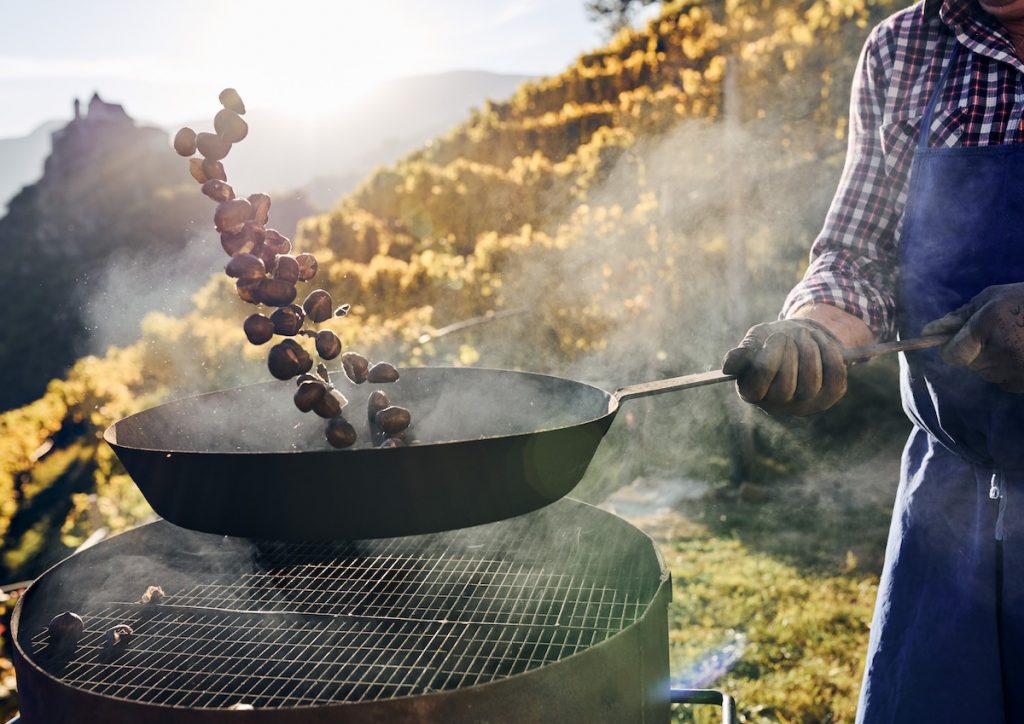Gemütliche Einkehr auf dem Hof eines Bergbauern im Südtiroler Ort Algund. Zum Türggelen gehören neben Rotwein vor allem Speck, Kaminwurzen und geröstete Esskastanien.