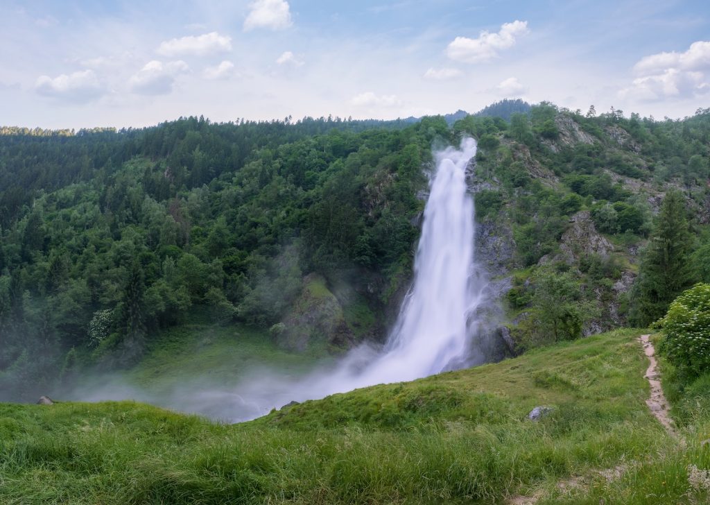 Am Partschinser Wasserfall in Südtirol stürzen während der Schneeschmelze zehntausend Liter Wasser pro Sekunde über die Klippen ins Tal, was gesunden Sauerstoff erzeugt.