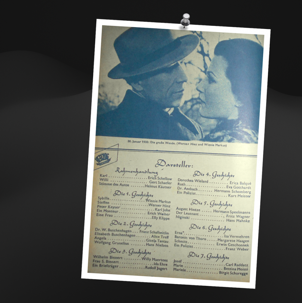 Die weiteren Protagonisten der Episoden sind Winnie Markus, Werner Hinz, Karl John, Franz Schafheitlin, Alice Treff, Hans Nielsen, Willy Maertens, Ida Ehre, Erica Balque, Hermann Schomberg, Eva Gotthardt, Hermann Speelmanns, Fritz Wagner, Isa Vermehren, Margarete Haagen, Erwin Geschonnek, Carl Raddatz und Bettina Moissi.