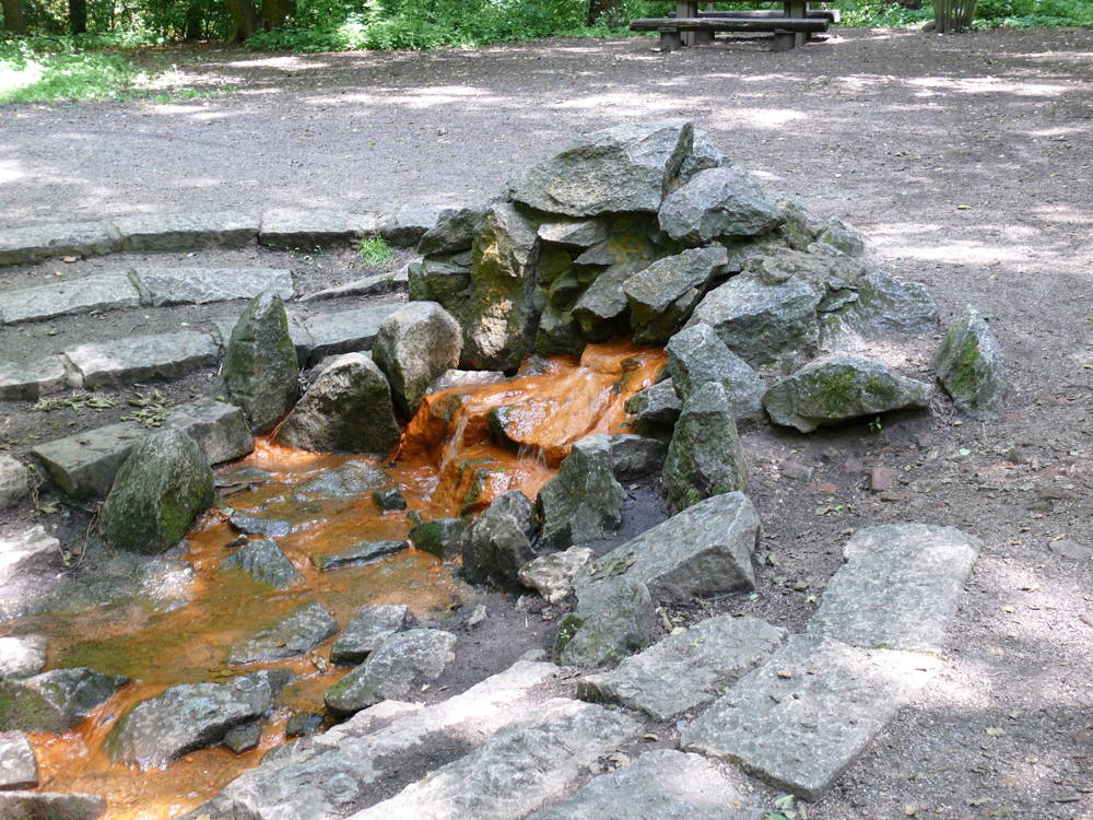 Und heute? Strahlender Sonnenschein als lockende Versuchung. Zuerst das Königsbrünnchen im Visier. Schon Jahrhunderte lang quillt hier das mit Eisenoxidhydrat angereicherte Wasser aus der Erde, doch eingefasst wurde die Quelle erst Ende des 19. Jahrhunderts. Und noch immer – wie bei meinen früheren Besuchen – sucht sich das Wasser seinen Weg durch das Felsgestein, das rötlich-braun gefärbt ist. Schwefelwasserstoff erzeugt an manchen Tagen einen Geruch von faulen Eiern, wer mutig genug ist, um sich mit einigen Tropfen zu laben, schmeckt Eisen…