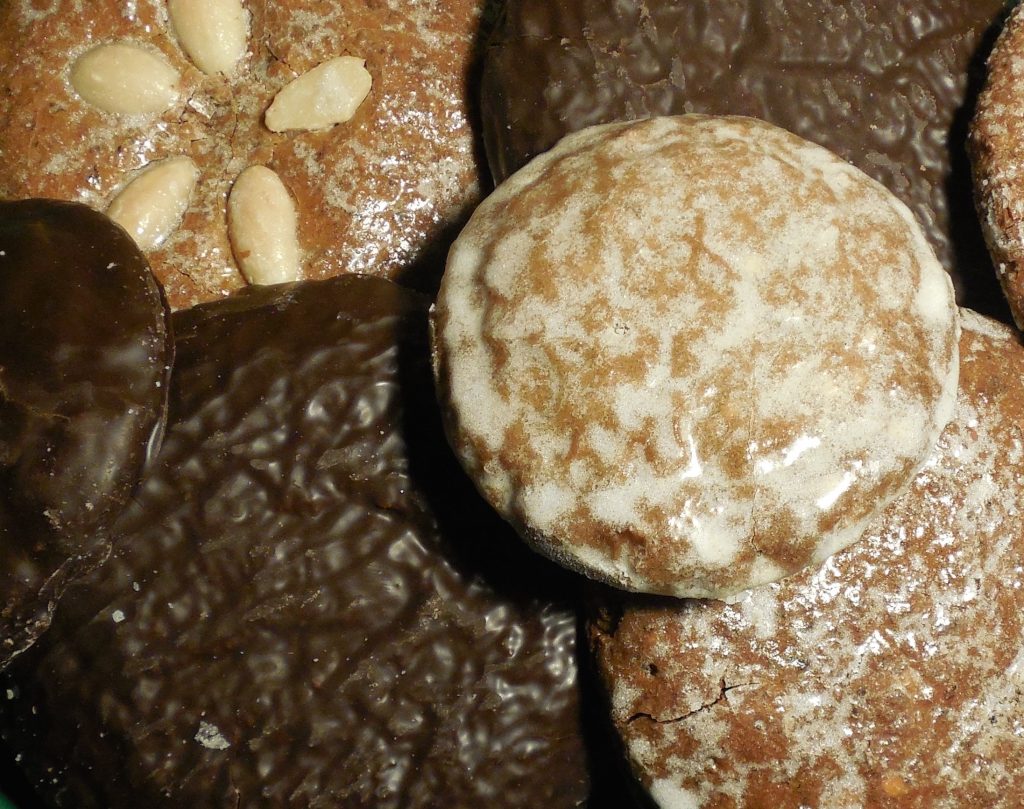 Und nicht nur in den großen Ladenketten locken mit den Gebäcken. Auch im Internet oder per normaler Briefpost flattern die Angebote ins Haus. Eine bekannte Firma schickt mir gar einen Katalog mit Abbildungen voller Köstlichkeiten, wundervoll verpackt in hübschen Truhen und Dosen mit Alt-Nürnberger Motiven, verlockend gestaltet von namhaften Künstlern und Designern. Was Lebkuchen so schmackhaft macht, sind die Zutaten. Außer dem üblichen Honig, Sirup und Mehl sind meist Hasel- und Walnüsse in Lebkuchen verarbeitet, weitere Zutaten aller Art runden das Bild ab. Wegen der gefühlt tausend Gewürzarten – darunter Anis, Fenchel, Muskat, Nelken, Zimt und andere – kräftigt der Genuss auch noch Magen und Darm, fördert die Verdauung und stärkt außerdem die Nerven.