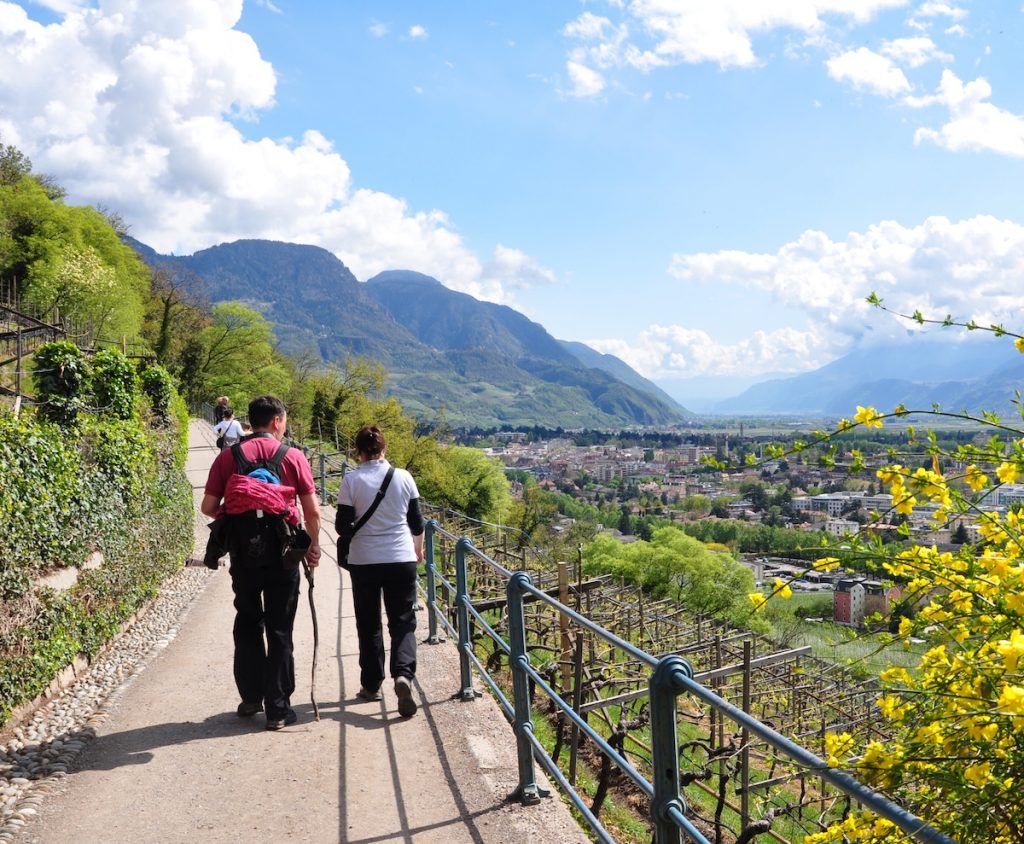 Der Spazierweg führt auf etwa 380 Meter Höhe vom Küchelberg über den nordöstlichen Hang entlang des Stadtzentrums. Hier zu lustwandeln ist ein Genuss ohne Reue, auch wenn die von der Werbung ausgestreuten Bezeichnungen als „Empore der paradiesischen Szenerie des Burggrafenamtes“ oder als „Krone Merans“ ein wenig zu hoch gegriffen erscheinen. Gleichwohl nehmen wir den Weg als Labsal wahr.