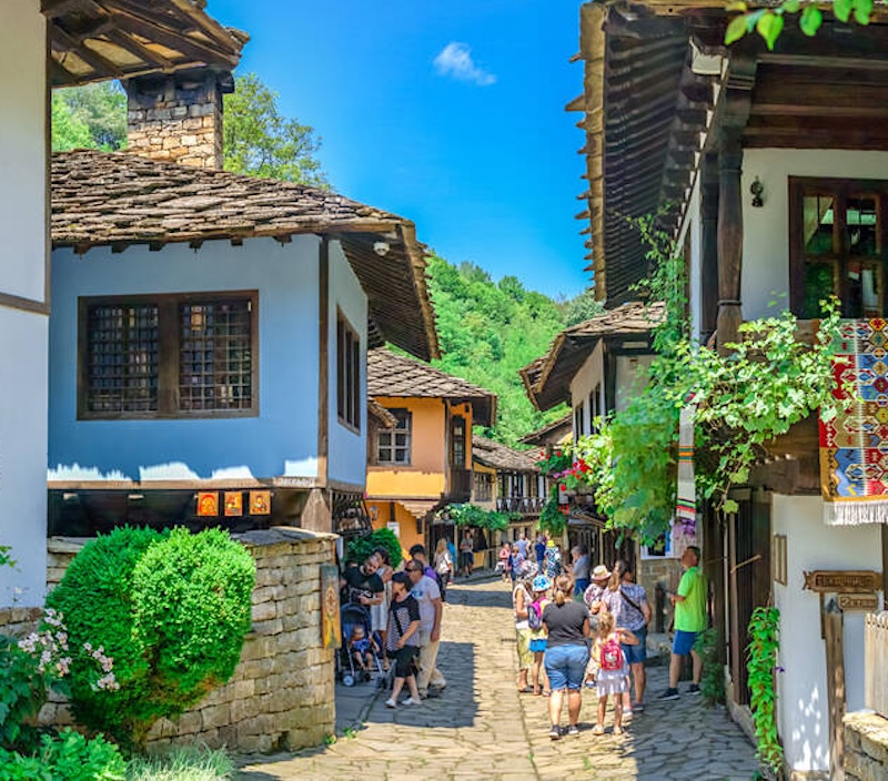 Deshalb biegen wir von der Schipka-Höhe kommend etwa neun Kilometer südlich der Stadt Gabrovo von der Pass-Strasse (E 85) rechts ab, suchen uns einen Parkplatz und nähern uns zu Fuß diesem Freilichtmuseum, das 1964 gegründet und von der damaligen kommunistischen Regierung zum Kulturdenkmal von nationaler Bedeutung erhoben wurde. Aber Vorsicht! Solides Schuhwerk ist Pflicht, denn fast alle Wege und Straßen sind „grobschlächtig” gepflastert. Eine junge Frau, die hochhackig daherstolziert, muss ihre „Kühnheit“ vor unseren Augen mit einem abgebrochenen Absatz bezahlen.