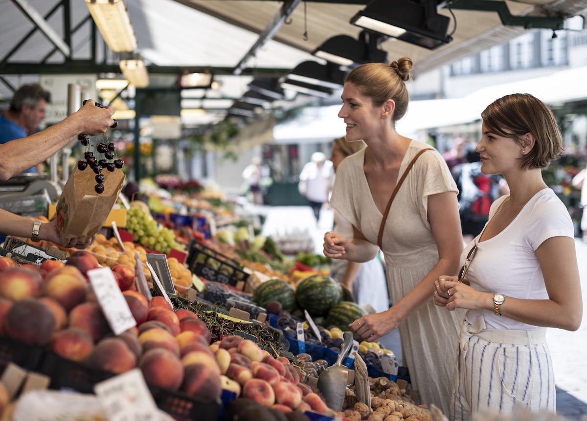 Chilischoten leuchten in sattem Rot neben grüner Rucola, daneben strahlen Knoblauch-Bündel, goldgelbe Pfifferlinge sind neben Ingwer-Knollen zu finden, Kürbisse und Melonen lachen fröhlich in die Welt, Südtiroler Äpfel aller Art füllen die Stände, Erd- und Himbeeren liegen in kleinen Körbchen. Im Herbst sind Weintrauben an fast jedem Stand in der Überzahl, frische oder getrocknete Tomaten liegen nebeneinander. Salate, Kohlrabi, Gurken und anderes Gemüse von Karotten bis zu Erbsen kommt frisch von den nahen Äckern, aber es gibt auch Obst aus fernen Ländern wie Mango, Bananen und Ananas.