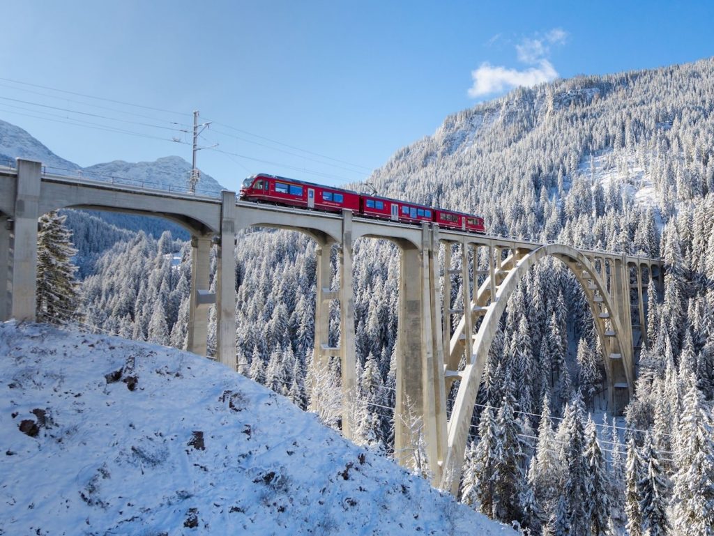 Die Bahn rumpelt stetig bergan, wobei es durch 19 Tunnels und 41 Brücken geht. Beeindruckend ist das Langwieser Viadukt, das zwei Schluchten in fast 50 Meter Höhe überquert. Auf der gesamten Strecke schützen Rampen und Galerien die Züge und Gleisanlagen vor Schneebrettern und Steinschlag. Doch diese Sicherheitsmaßnahmen sind in die Jahre gekommen, und auch das Gestein selbst ist der Erosion ausgeliefert. Nachdem 2017 durch Steinschlag einige Bäume auf die Gleise stürzten, sollen in den kommenden Jahren rund 1,4 Millionen Schweizer Franken in den weiteren Ausbau von Felsvernetzungen und Schutzgittern investiert werden.