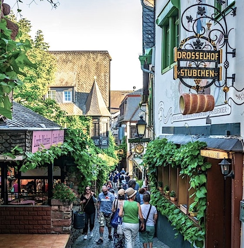 Diese Drosselgasse hat eine lange Geschichte. Einst dienten die Häuser rechts und links als Unterkünfte für Rheinschiffer, doch im 18. und 19. Jahrhundert entstanden Straußwirtschaften, in denen selbst gemachter Wein oder Federweißer ausgeschenkt wurde. Auch Cafés oder Bierkneipen haben sich etabliert. Drosselhof, Lindenwirt, Drosseleck und Drosselhof prägen die Gasse, Quetschkommod, Gasthof Hannelore und Eissalon Piccolo runden das Bild ab, Souvenirs überall, an einer Hausecke steht ein Leierkastenmann und spielt weinselige Musik.