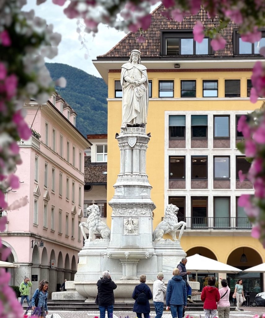 Beim Spaziergang kreuz und quer durch enge, verwinkelte Gassen und Laubengänge, teils über Kopfsteinpflaster, passieren wir die Madonnen-Apotheke, die mit ihrer historischen Einrichtung bekannt geworden ist, und erfreuen uns auf dem Walther-Platz an Straßenkünstlern und dem Denkmal des Minnesängers Walther von der Vogelweide, hören wie beiläufig einem Stadtführer zu, der über die historische Entwicklung der Stadt referiert. Das Abbild des berühmten Minnesänger thront indessen lässig über der Geschäftigkeit der Stadt.