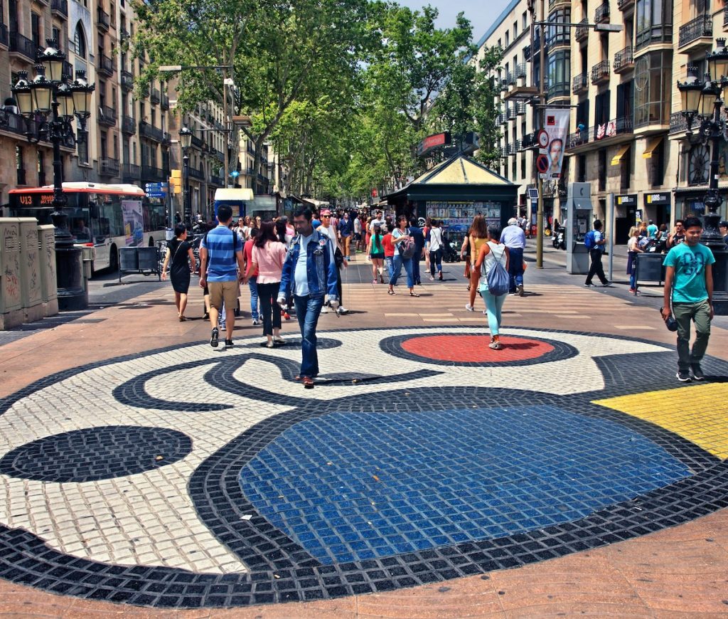 Zurück vom Denkmal schlendern wir weiter und beginnen unseren Weg über die „Rambla dels Caputxins”. Wir erblicken auf der Südseite das „Gran Teatre del Liceu”, eines der bekanntesten Opernhäuser der Welt. Schräg gegenüber befindet sich das Opern-Cafè. Nahe der U-Bahn-Station Liceu sehen wir auf dem Boden ein kreisförmiges Keramikmosaik des bekannten katalanischen Malers Joan Miró samt Signatur des Künstlers. Viele Passanten laufen achtlos vorbei, fast ohne es zu bemerken.