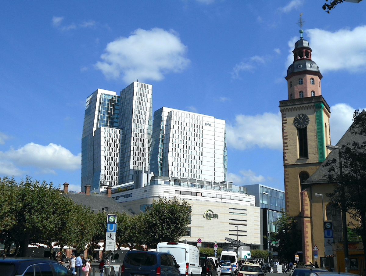 Die leicht geknickten Fassaden aus Aluminium und Glas verleihen dem neu erbauten Gebäude, in dem auch ein 99 Meter hohes Hotel seinen Platz fand, besonders im Sonnenlicht einen funkelnden Glanz. Ein tief liegendes Parkhaus mit Verbindung zum Einkaufszentrum MyZeil sollen Umsatz und Kommerz im Mittelpunkt der großen Stadt fördern, doch Medienberichte besagen, das vermietungsmäßig nicht alles Gold ist, was da zu glänzen scheint…