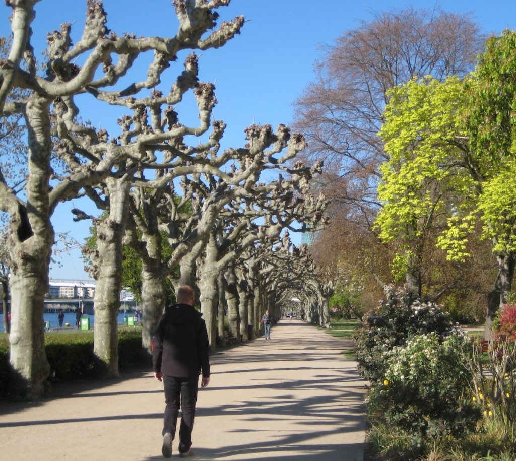 Ich frage mich, wie dieses Nizza an den Main kam und erhalte die Antwort in Geschichtsbüchern. Der Frankfurter Stadtgärtner Sebastian Rinz (1782-1861) hatte früh entdeckt, dass in diesem kleinen Abschnitt am Mainufer ein günstiges Mikroklima herrschte, begünstigt durch Sonneneinstrahlung und wuchtig-hohe Kaimauern aus Sandstein, die ständig die gespeicherte Wärme abstrahlen. Sein Nachfolger (und Enkel) Andreas Weber veranlasste 1875 die Stadtverwaltung, Pflanzen aus der Nähe von Nizza zu importieren und anzubauen, was dem Park im Hinblick auf die Herkunft der Gewächse dann den Namen gab: Nizza.