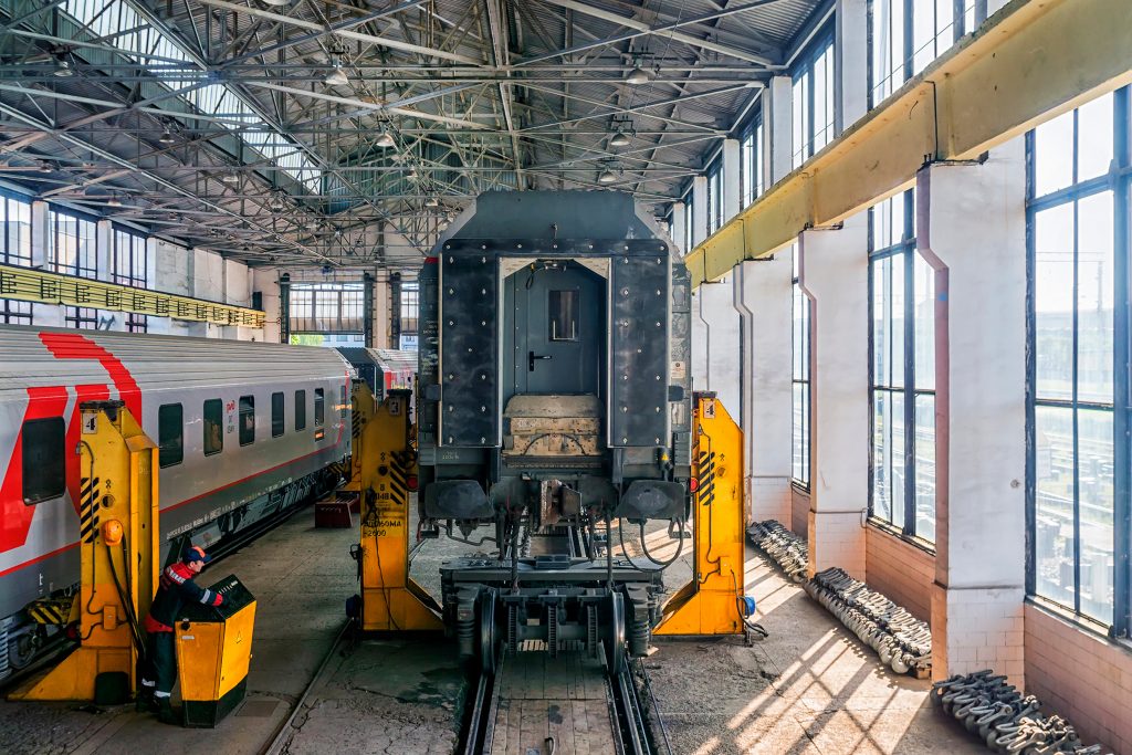 Aber es war ein anderes, uns unbekanntes Land, ein Land hinter dem Eisernen Vorhang. Wir versuchten die kyrillischen Buchstaben über den Geschäften zu deuten und die Überschriften der Zeitungen zu entziffern. Während wir mangels russischer Sprachkenntnisse nur geringe Erfolge verbuchten, wurde der Zug in die Montagehalle gefahren, getrennt, die Fahrgestelle gelöst und die Waggons durch hydraulische Hebeböcke angehoben; die Fahrwerke mit Hilfe eines Seilzuges heraus-, die Breitspur-Untersätze vom anderen Ende hereingezogen und unter den Waggons positioniert. Diese setzen auf die neuen Untersätze auf. Der Räder- und Achsenwechel eine Routinesache, tausenfach erprobt und tagtäglich durchgeführt. Anschliessend wurden die Waggons zusammengekoppelt und als kompletter Zug zur Abfahrt am Bahnsteig bereitgestellt. Und die Fahrt ging weiter…