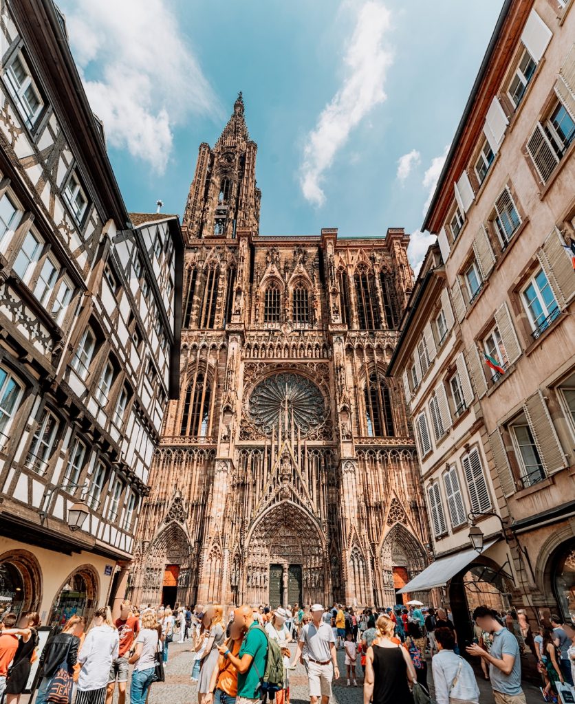 Der Turm ist 142 Meter hoch und aus rosafarbenem Sandstein der Vogesen errichtet. 263 Jahre (1176-1439) wurde an der Kirche gewerkelt; der Dichter Victor Hugo bezeichnete deutlicher als Goethe das Meisterwerk gotisch-romanischer Baukunst als „Wunder, unermesslich und zierlich zugleich.” Beeindruckend neben dem Münster auch die malerischen mit Kopfsteinpflaster bestückten schmalen Gassen im Altstadtviertel „Petit France” und neuerdings das Europaviertel mit dem Parlamentsgebäude und anderen architektonisch interessanten Bauten.