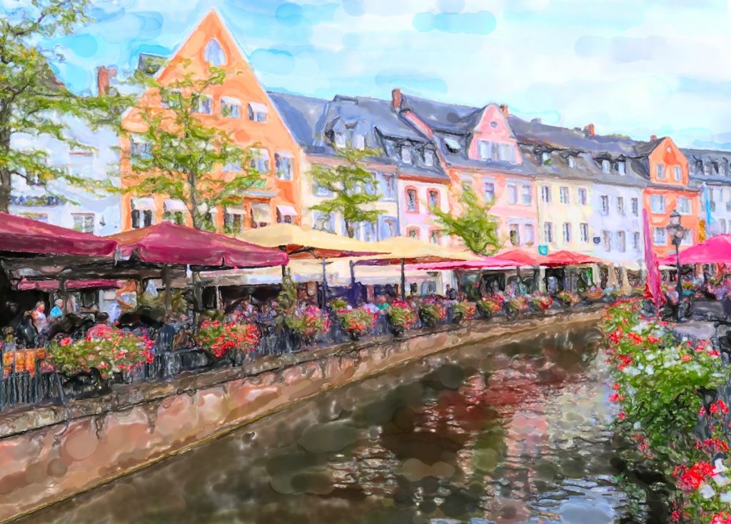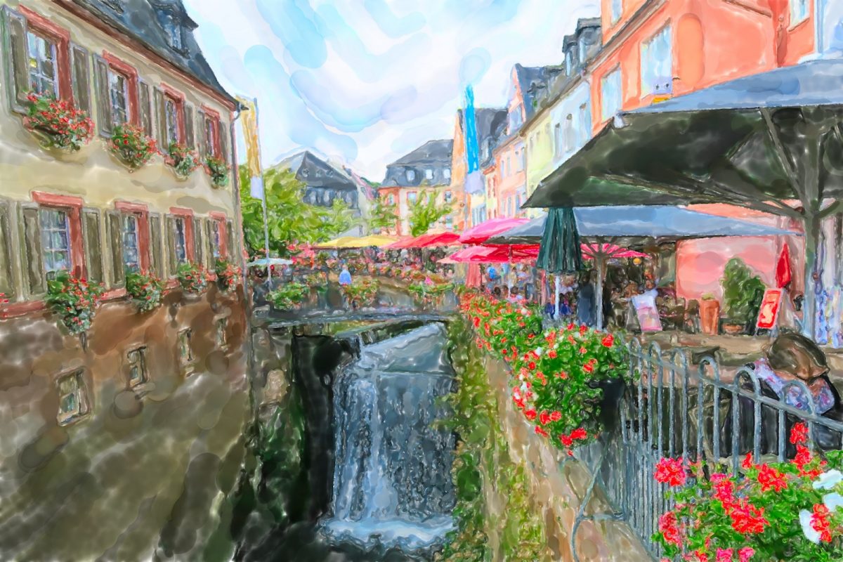 Die Fischer- und Schifferhäuser – auf schweren Eichenpfählen ruhend – sind bunt gestrichen und gepflegt, malerische Gassen machen das Flanieren zum Genuss. Ich sehe eine „Schatztruhe“ voller antiker Waren, eine Boutique mit feinen Gewändern und ein weniger modisches Texilgeschäft. Doch das sind neben einem Hotel eher die Ausnahmen von der Regel. Restaurants und Cafés sind in der Überzahl. Kleine Brücken oder Stege verbinden die beiden Seiten des Leukbachs bevor er nach dem Waserfall in die Saar mündet.