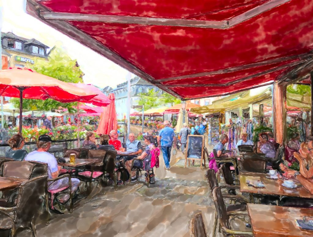 Nach längerem Erkundungsgang setze ich mich an einen der Tische und beobachte eine ältere Dame, die an ihrem Kaffee nippt und vom Kuchen nascht, gleichzeitig mit einer hellbraun getigerten Katze palavert, die leise miauend um ihren Tisch herumstreicht. Schlechte Situation für einige Vögel, die am Boden herabgefallene Krümel aufpicken möchten. Ein Mann betagten Alters schmaucht genüsslich sein Pfeifchen. Aus einem der Lokale ertönt leise Musik, eher schnulzig als modern. Es kommt keine Hektik auf, selbst die Bedienenden strahlen Gelassenheit und Ruhe aus. Es ist Nachmittag, die Zeit scheint stillzustehen, es entwickelt sich ein Hang zur Schläfrigkeit. Weit aufgespannte Schirme spenden gnädigen Schatten gegen Sonnenstrahlen.